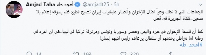 وقال في تغريدة عبر "تويتر" رصدها "المشهد العربي": "الجماعات التي لا تملك وعياً أمثال الإخوان وأنصار مليشيات إيران تصبح قطيع غنم يسوقه إعلام بلا ضمير.. كقناة الجزيرة في قطر. كما أن فلسفة الإخوان في غزة واليمن ومصر وسوريا وتونس ومرتزقة تركيا في ليبيا..هي أن الفرد في وطنه إما مواطن يخدمهم أو سلطان يرعاهم وليس لديهم إنسان".