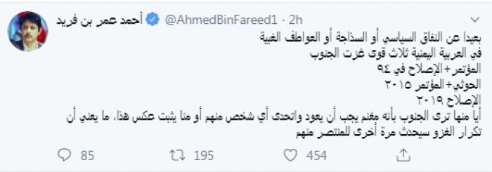 وقال في تغريدة عبر "تويتر" رصدها "المشهد العربي": "بعيدًا عن النفاق السياسي أو السذاجة أو العواطف الغبية في العربية اليمنية ثلاث قوى غزت الجنوب المؤتمر+ الإصلاح في ٩٤، الحوثي + المؤتمر ٢٠١٥،الإصلاح ٢٠١٩،أيًا منها ترى الجنوب بأنه مغنم يجب أن يعود واتحدى أي شخص منهم أو منا يثبت عكس هذا، ما يعني أن تكرار الغزو سيحدث مرة أخرى للمنتصر منهم".