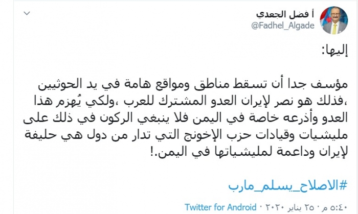 وقال الجعدي في تغريدة نشرها عبر حسابة بـ"تويتر"، رصدها "المشهد العربي": "إليها:مؤسف جدا أن تسقط مناطق ومواقع هامة في يد الحوثيين فذلك هو نصر لإيران العدو المشترك للعرب".