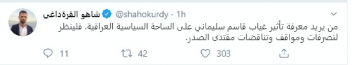 أكد الكاتب الصحفي العراقي شاهو القرةداغي، اليوم، أن تناقضات زعيم التيار الصدري بالعراق، تكشف تأثير غياب قاسم سليماني من الساحة السياسية العراقية.