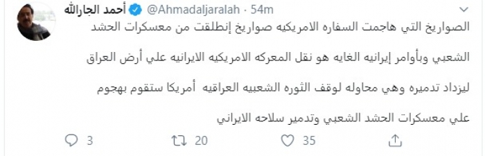 وقال في تغريدة عبر "تويتر" رصدها "المشهد العربي": "الصواريخ التي هاجمت السفارة الأمريكية صواريخ انطلقت من معسكرات الحشد الشعبي وبأوامر إيرانية الغاية هو نقل المعركة الأمريكية الإيرانية علي أرض العراق ليزداد تدميره وهي محاوله لوقف الثورة الشعبية العراقية. أمريكا ستقوم بهجوم على معسكرات الحشد الشعبي وتدمير سلاحه الإيراني".