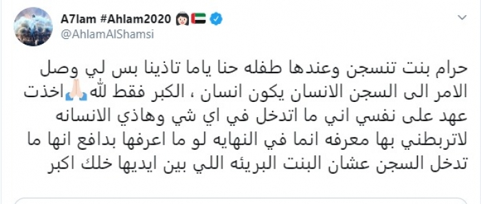 نشرت الفنانة الإماراتية أحلام، عبر حسابها الشخصي، بـ"تويتر" تغريدة تعلق بها على الحكم بحبس الفنانة مريم حسين شهرا.