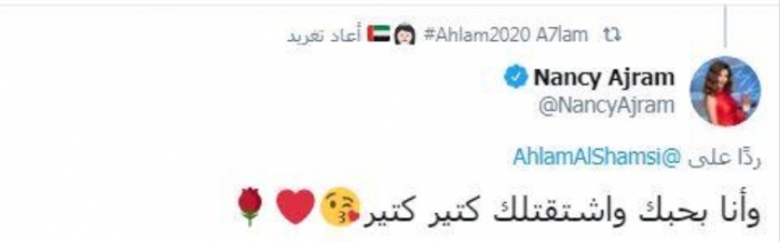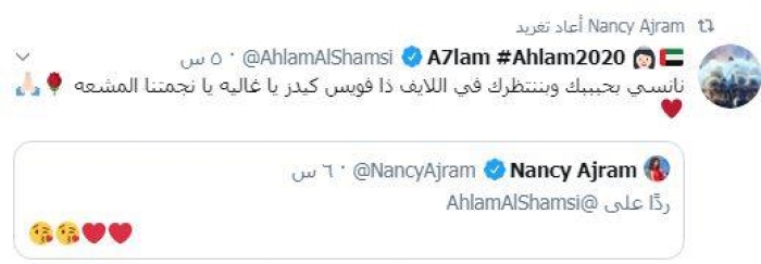 وكتبت أحلام: "نانسي بحبك وبنتظرك في اللايف، ذا فويس كيدز ياغالية يا نجمتنا المشعة"، وردت "نانسي": "وأنا بحبك واشتقتلك كتير كتير".