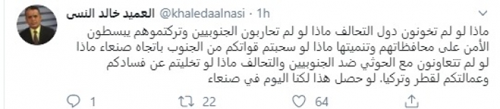 وقال في تغريدة عبر "تويتر" رصدها "المشهد العربي": "ماذا لو لم تخونون دول التحالف ماذا لو لم تحاربون الجنوبيين وتركتموهم يبسطون الأمن على محافظاتهم وتنميتها ماذا لو سحبتم قواتكم من الجنوب باتجاه صنعاء ماذا لو لم تتعاونون مع الحوثي ضد الجنوبيين والتحالف ماذا لو تخليتم عن فسادكم وعمالتكم لقطر وتركيا. لو حصل هذا لكنا اليوم في صنعاء".