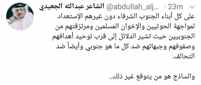 وكتب الجعيدي، في تغريدة له على موقع التواصل الاجتماعي تويتر، تابعها المشهد العربي: "على كل أبناء الجنوب الشرفاء دون غيرهم الاستعداد لمواجهة الحوثيين والإخوان المسلمين ومرتزقتهم من الجنوبيين".