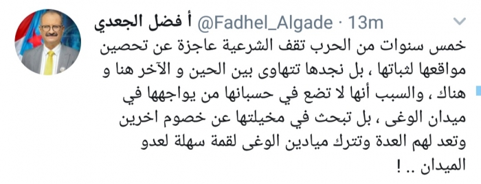وكتب الجعدي، في تغريدة له على موقع التواصل الاجتماعي تويتر، تابعها المشهد العربي: "خمس سنوات من الحرب تقف الشرعية عاجزة عن تحصين مواقعها لثباتها، بل نجدها تتهاوى بين الحين و الآخر هنا و هناك".