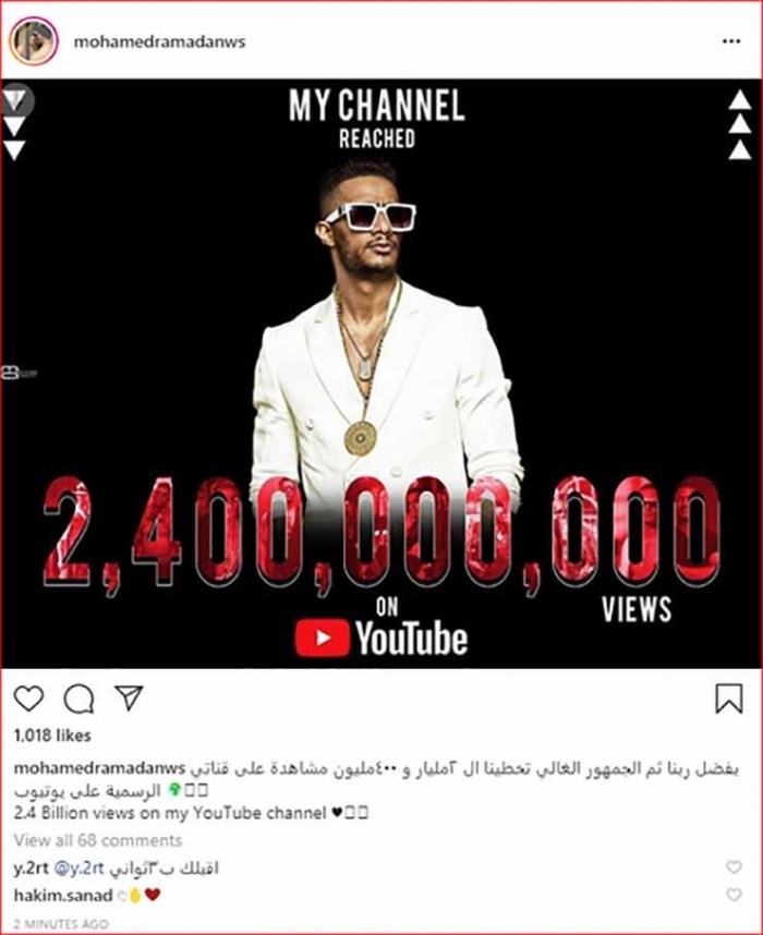 وشارك "رمضان"، جمهوره بصورة له، عبر حسابه الخاص على انستجرام وعلق عليها قائلًا: "بفضل ربنا ثم الجمهور الغالي تخطينا الـ٢مليار و٤٠٠مليون مشاهدة على قناتي الرسمية على يوتيوب".