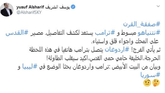 وقال في تغريدة عبر "تويتر" رصدها "المشهد العربي": "صفقة القرن نتنياهو مبسوط وترامب يستعد لكشف التفاصيل. مصير القدس على المحك واجواء قلق واستياء. ثم يأتي الفرج! أردوغان يتصل بترامب هاتفيا في هذه اللحظة الحرجة، الخليفة حامي حمى القدس،اكيد سيقلب الطاولة! وبيان من البيت الأبيض: ترامب وأردوغان بحثا الوضع في ليبيا وسوريا".
