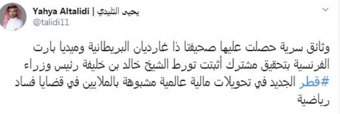 وقال في تغريدة عبر "تويتر" رصدها "المشهد العربي": "وثائق سرية حصلت عليها صحيفتا ذا غارديان البريطانية وميديا بارت الفرنسية بتحقيق مشترك أثبتت تورط الشيخ خالد بن خليفة رئيس وزراء قطر الجديد في تحويلات مالية عالمية مشبوهة بالملايين في قضايا فساد رياضية".