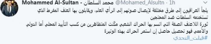 وقال في تغريدة عبر "تويتر" رصدها "المشهد العربي": "يلجأ العراقيون إلى طرق مختلفة لإيصال صوتهم إلى الرأي العام، ويقابلون بها العنف المفرط الذي تستخدمه السلطات ضد المحتجين ثورة اللاعنف الصفة التي اتسم بها الحراك الشعبي مكّنت المتظاهرين من كسب التأييد المحلي أما الدولي والأممي فهو تحصيل حاصل إن استمر الحراك بهذه الوتيرة".