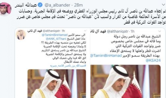 وقال في تغريدة عبر "تويتر": "تم إعفاء عبدالله بن ناصر آل ثاني رئيس مجلس الوزراء القطري ووضعه في الإقامة الجبرية، وحسابات من الأسرة الحاكمة غاضبة من القرار والسبب لأن عبدالله بن ناصر تحدث في مجلس خاص عن ضرر تواجد القوات التركية في قطر".