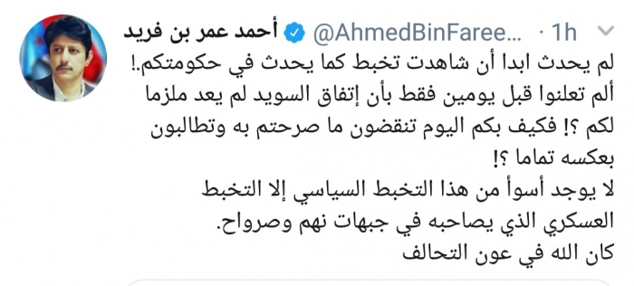 بن فريد يهاجم قيادات الشرعية.. ويتهمهم بـ التخبط