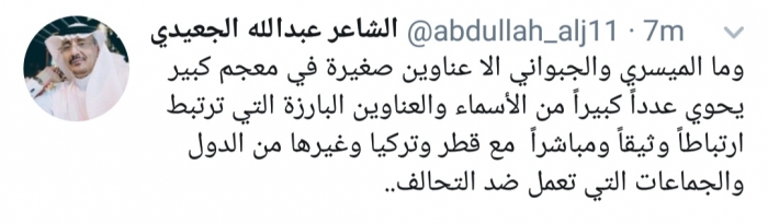 وكتب الجعيدي، في تغريدة له على موقع التواصل الاجتماعي تويتر، تابعها المشهد العربي: "وما الميسري والجبواني إلا عناوين صغيرة في معجم كبير يحوي عدداً كبيراً من الأسماء والعناوين البارزة التي ترتبط ارتباطاً وثيقاً ومباشراً مع قطر وتركيا وغيرها من الدول والجماعات التي تعمل ضد التحالف".