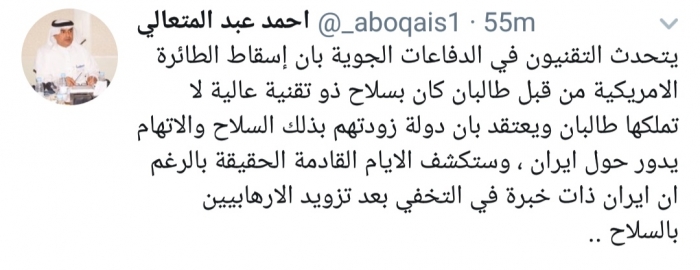 وكتب عبد المتعالي، في تغريدة له على موقع التواصل الاجتماعي تويتر، تابعها المشهد العربي: "تحدث التقنيون في الدفاعات الجوية بأن إسقاط الطائرة الأمريكية من قبل طالبان كان بسلاح ذو تقنية عالية لا تملكها طالبان ويعتقد بأن دولة زودتهم بذلك السلاح والاتهام يدور حول إيران".