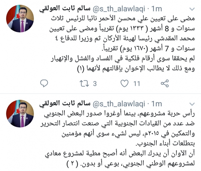 وكتب العولقي، في تغريدة له عبر موقع التواصل الاجتماعي تويتر، تابعها المشهد العربي: "مضى على تعيين علي محسن الأحمر نائبا للرئيس ثلاث سنوات و 8 أشهر أي ١٣٣٣ يوم تقريباً ومضى على تعيين محمد المقدشي رئيسا لهيئة الأركان ثم وزيرا للدفاع ٤ سنوات و 7 أشهر أي ١٦٧٠ يوم تقريباً".