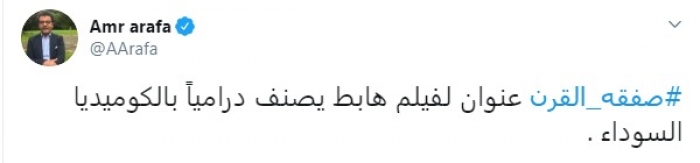 وكتب عرفة، عبر حسابه على تويتر: "صفقة القرن، عنوان لفيلم هابط يصنف دراميا بالكوميديا السوداء".