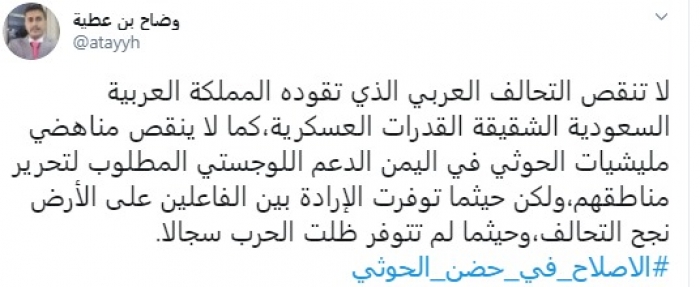 وقال في تغريدة عبر "تويتر" رصدها "المشهد العربي": "لا تنقص التحالف العربي الذي تقوده المملكة العربية السعودية الشقيقة القدرات العسكرية، كما لا ينقص مناهضي مليشيات الحوثي في اليمن الدعم اللوجستي المطلوب لتحرير مناطقهم، ولكن حيثما توفرت الإرادة بين الفاعلين على الأرض نجح التحالف، وحيثما لم تتوفر ظلت الحرب سجالا".