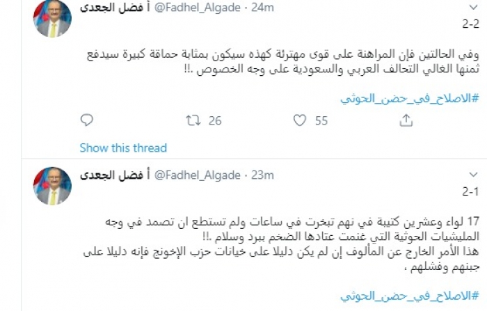وأضاف في تغريدة أخرى: "وفي الحالتين فإن المراهنة على قوى مهترئة كهذه سيكون بمثابة حماقة كبيرة سيدفع ثمنها الغالي التحالف العربي والسعودية على وجه الخصوص".