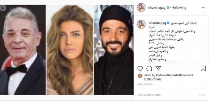 ونشرت ريهام، صورتها مع حميدة والنبوي، عبر حسابها على"إنستجرام"، وعلقت: "الأستاذ كبير العظيم محمود حميدة.. والأسطورة طومان باي، النجم العالمي صاحب الموهبة الكبيرة خالد النبوي، يلتقون في مسلسل لما كنا صغيرين رمضان 2020، بطولة النجمة نسرين أمين والنجوم كريم قاسم ونبيل عيسي ومحمود حجازي، للمؤلف الكبير أيمن سلامة، والمخرج الكبير محمد علي، يا رب نكون عند حسن ظنكم بإذن الله".