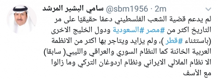 وكتب المرشد، في تغريدة له على موقع التواصل الاجتماعي تويتر، تابعها المشهد العربي: "لم يدعم قضية الشعب الفلسطيني دعمًا حقيقيًا على مر التاريخ أكثر من مصر السعودية ودول الخليج الأخرى باستثناء قطر".