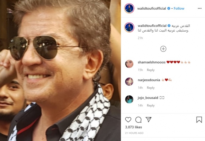 ونشر "توفيق" عبر حسابه الرسمي بموقع إنستجرام، صورة له بالكوفيه الفلسطينية، وعلق: "القدس عربية وستبقى عربية، البيت لنا والقدس لنا".