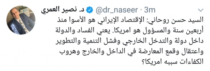 وكتب العمري، في تغريدة له على موقع التواصل الاجتماعي تويتر، تابعها المشهد العربي: "السيد حسن روحاني: الاقتصاد الإيراني هو الأسوا منذ أربعين سنة والمسؤول هو أمريكا".