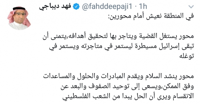 قسم المحلل السياسي السعودي فهد ديباجي، المنطقة إلى محورين، وكشف عن توجهاتهما تجاه القضية الفلسطينية.