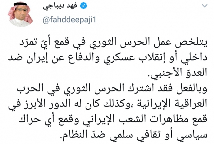 وكتب ديباجي، في تغريدة له عبر موقع التواصل الاجتماعي تويتر، تابعها المشهد العربي: "يتلخص عمل الحرس الثوري في قمع أيّ تمرّد داخلي أو انقلاب عسكري والدفاع عن إيران ضد العدوّ الأجنبي".