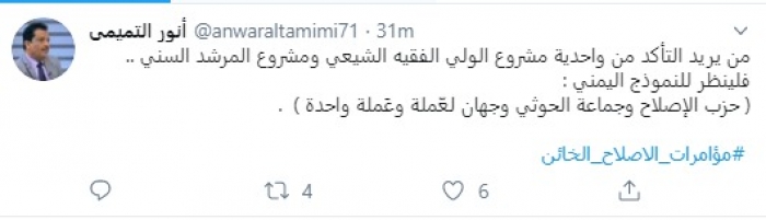 وقال في تغريدة عبر "تويتر" رصدها "المشهد العربي": "من يريد التأكد من واحدية مشروع الولي الفقيه الشيعي ومشروع المرشد السني.. فلينظر للنموذج اليمني: (حزب الإصلاح وجماعة الحوثي وجهان لعّملة وعَملة واحدة)".