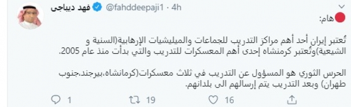وقال في تغريدة عبر "تويتر" رصدها "المشهد العربي": "تُعتبر إيران أحد أهم مراكز التدريب للجماعات والميليشيات الإرهابية (السنية والشيعية) وتُعتبر كرمنشاه إحدى أهم المعسكرات للتدريب والتي بدأت منذ عام 2005".