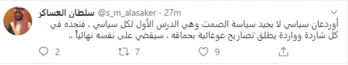 وقال في تغريدة عبر "تويتر" رصدها "المشهد العربي": "أردوغان سياسي لا يجيد سياسة الصمت وهي الدرس الأول لكل سياسي، فتجده في كل شاردة وواردة يطلق تصاريح غوغائية بحماقة، سيقضي على نفسه نهائياً".