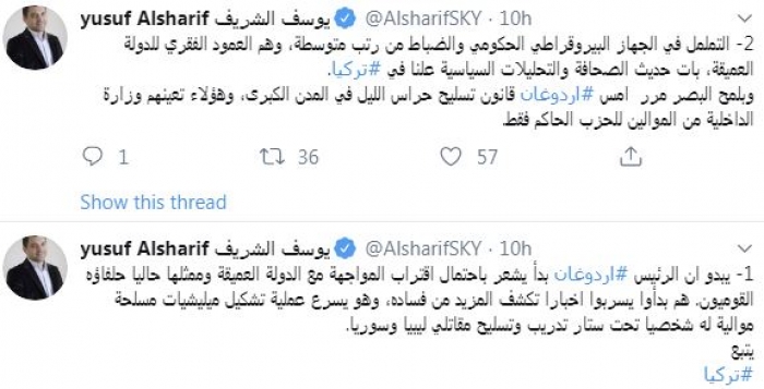 وأضاف: "التململ في الجهاز البيروقراطي الحكومي والضباط من رتب متوسطة، وهم العمود الفقري للدولة العميقة، بات حديث الصحافة والتحليلات السياسية علنا في تركيا. وبلمح البصر مرر أمس أردوغان قانون تسليح حراس الليل في المدن الكبرى، وهؤلاء تعينهم وزارة الداخلية من الموالين للحزب الحاكم فقط".
