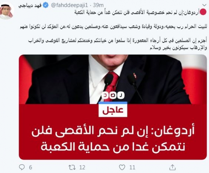وقال في تغريدة عبر "تويتر" رصدها "المشهد العربي": "أردوغان.. إن لم نحم خصوصية الأقصى فلن نتمكن غداً من حماية الكعبة للبيت الحرام رب يحميه، ودولة وقيادة وشعب سيدافعون عنه،ومسلمين يدعون له، من المؤكد لن تكونوا منهم أجزم أن المسلمين في كل أرجاء المعمورة إذا سلموا من خيانتكم وخدمتكم لمشاريع الفوضى والخراب والإرهاب سيكونون بخير وسلام".