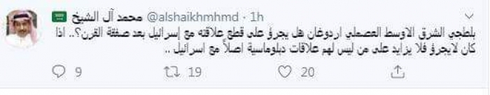 وقال في تغريدة عبر "تويتر" رصدها "المشهد العربي": "بلطجي الشرق الاوسط العصملي أردوغان هل يجرؤ على قطع علاقته مع إسرائيل بعد صفقة القرن؟.. إذا كان لايجرؤ فلا يزايد على من ليس لهم علاقات دبلوماسية أصلاً مع إسرائيل".