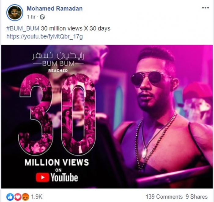 ونشر رمضان صورة من الكليب عبر حسابه على"فيسبوك"، وعلق: "بوم.. بوم، 30 مليون مشاهدة فى 30 يوم".