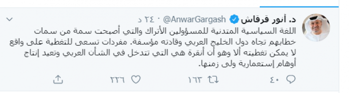 وكتب قرقاش عبر "تويتر":"اللغة السياسية المتدنية للمسئولين الأتراك والتي أصبحت سمة من سمات خطابهم تجاه دول الخليج العربي وقادته مؤسفة".