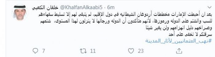 وقال في تغريدة عبر "تويتر" رصدها "المشهد العربي": "بعد أن أحبطت الإمارات مخططات أردوغان الشيطانية في دول الإقليم، لم يتبقى لهم إلا تسليط سفهاءهم للسب والشتم على الدولة ورموزها، لأنهم متأكدون أن الدولة ورجالها لا ينزلون لهذا المستوى، شتمهم وصراخهم دليل انهزامهم ولن يغير شيئاً سرقتكم لا تخفى على أحد.. نهب العثمانيين لآثار المدينة".