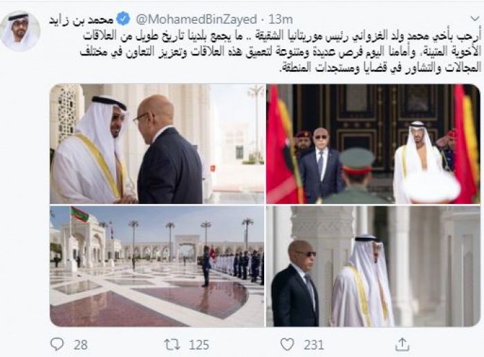 رحب ولي عهد أبو ظبي الشيخ محمد بن زايد آل نهيان، اليوم، برئيس موريتانيا محمد ولد الغزواني، مؤكدًا أن العلاقات بين الإمارات وموريتانيا متينة وأخوية.