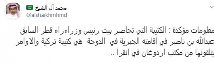 وكتب في تغريدة عبر "تويتر" رصدها "المشهد العربي":"معلومات مؤكدة.. الكتيبة التي تحاصر بيت رئيس وزراء قطر السابق عبدالله بن ناصر في إقامته الجبرية في الدوحة هي كتيبة تركية والأوامر يتلقونها من مكتب أردوغان في أنقرة".