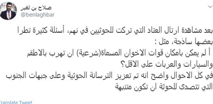 طالب الإعلامي صلاح بن لغبر، اليوم، جبهات الجنوب التي تتصدى لمليشيات الحوثي بالانتباه، وذلك بعد الغنائم التي حصلت عليها المليشيات بعد سقوط نهم.