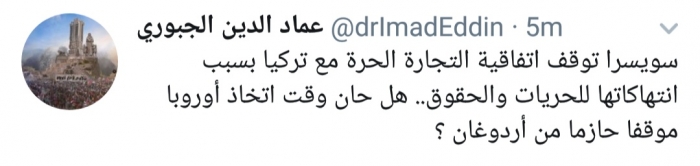 وكتب الجبوري، في تغريدة له عبر موقع التواصل الاجتماعي تويتر، تابعها المشهد العربي: "سويسرا توقف اتفاقية التجارة الحرة مع تركيا بسبب انتهاكاتها للحريات والحقوق".