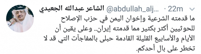 وكتب الجعيدي، في تغريدة له عبر موقع التواصل الاجتماعي تويتر، تابعها المشهد العربي: " ما قدمته الشرعية وإخوان اليمن في حزب الإصلاح للحوثيين أكثر بكثير مما قدمته إيران".