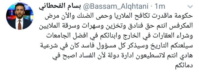 وكتب القحطاني، في تغريدة له عبر موقع التواصل الاجتماعي تويتر، تابعها المشهد العربي: "حكومة ماقدرت تكافح الملاريا وحمى الضنك والأن مرض المكرفس".