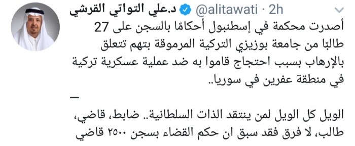 وكتب القرشي، في تغريدة له على موقع التواصل الاجتماعي تويتر، تابعها المشهد العربي: "أصدرت محكمة في إسطنبول أحكامًا بالسجن على 27 طالبًا من جامعة بوزيزي التركية المرموقة بتهم تتعلق بالإرهاب بسبب احتجاج قاموا به ضد عملية عسكرية تركية في منطقة عفرين في سوريا".