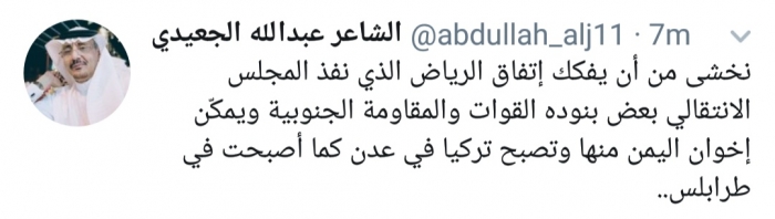 وكتب الجعيدي، في تغريدة له على موقع التواصل الاجتماعي تويتر، تابعها المشهد العربي: "نخشى من أن يفكك اتفاق الرياض الذي نفذ المجلس الانتقالي بعض بنوده القوات والمقاومة الجنوبية ويمكّن إخوان اليمن منها وتصبح تركيا في عدن كما أصبحت في طرابلس".