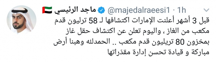وكتب الرئيسي، في تغريدة له على موقع التواصل الاجتماعي تويتر، تابعها المشهد العربي: "قبل 3 أشهر أعلنت الإمارات اكتشافها لـ 58 ترليون قدم مكعب من الغاز واليوم تعلن عن اكتشاف حقل غاز بمخزون 80 تريليون قدم مكعب".