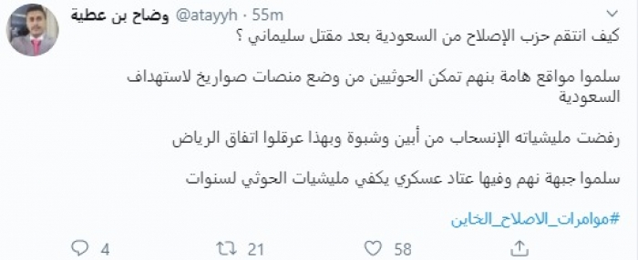 وقال في تغريدة عبر "تويتر" رصدها "المشهد العربي": "كيف انتقم حزب الإصلاح من السعودية بعد مقتل سليماني؟.. سلموا مواقع هامة بنهم تمكن الحوثيين من وضع منصات صواريخ لاستهداف السعودية".