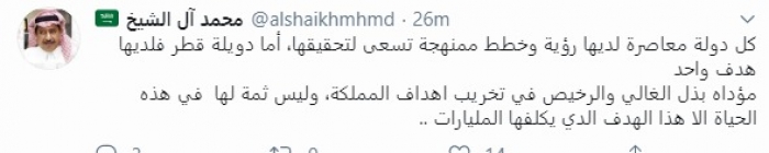 وقال في تغريدة عبر "تويتر" رصدها "المشهد العربي": "كل دولة معاصرة لديها رؤية وخطط ممنهجة تسعى لتحقيقها، أما دويلة قطر فلديها هدف واحد مؤداه بذل الغالي والرخيص في تخريب أهداف المملكة، وليس ثمة لها في هذه الحياة إلا هذا الهدف الدي يكلفها المليارات".
