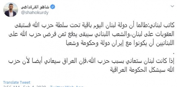 وكتب في تغريدة عبر "تويتر" رصدها "المشهد العربي": "كاتب لبناني.. طالما أن دولة لبنان اليوم باقية تحت سلطة حزب الله فستبقى العقوبات على لبنان، والشعب اللبناني سيبقى يدفع ثمن فرض حزب الله على اللبنانيين أن يكونوا مع إيران دولة وحكومة وشعبا.. إذا كانت لبنان ستعاني بسبب حزب الله، فإن العراق سيعاني أيضا لأن حزب الله سيشكل الحكومة العراقية".
