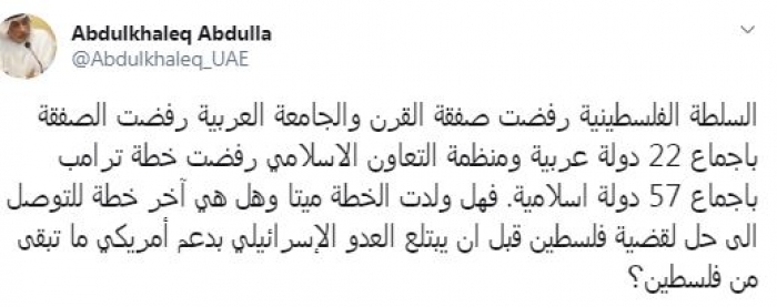 طرح الأكاديمي والسياسي الإماراتي الدكتور عبدالخالق عبدالله، اليوم، تساؤلات عدة بشأن صفقة القرن ومستقبلها.